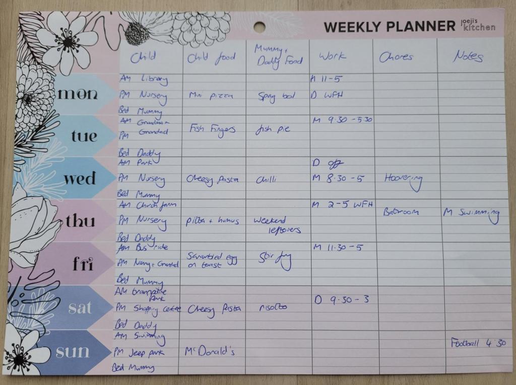 My husband never really knew whether I was coming or going, so writing it all down helped us both figure out where we were supposed to be, and whether there were any challenges like late meetings to plan for.